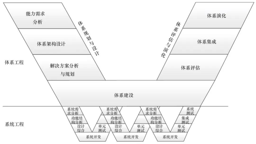 体系工程V形模型在一定程度上成为现有体系工程方法模型的典型代表,可以理解为多系统顶层设计和效果验证以及与多系统建设的叠加而构成的方法模型,对体系的研究开发有一定的理论指导作用。