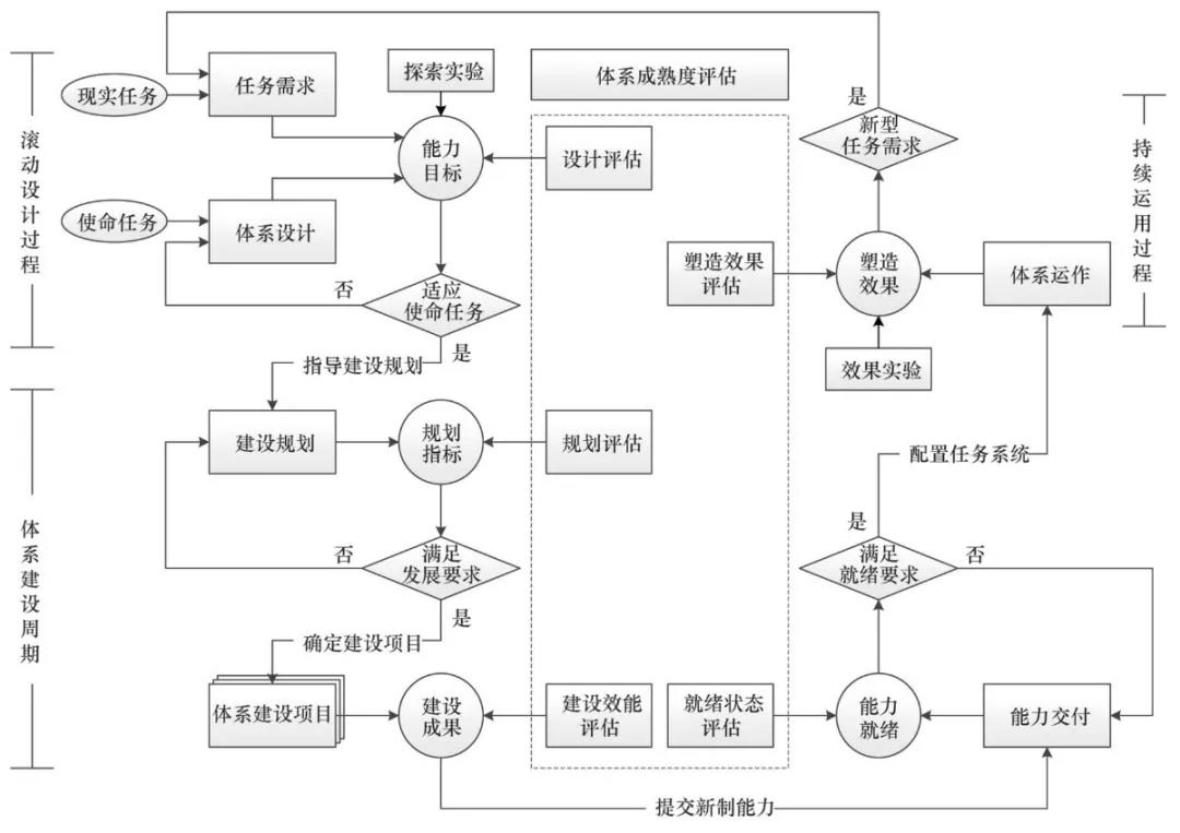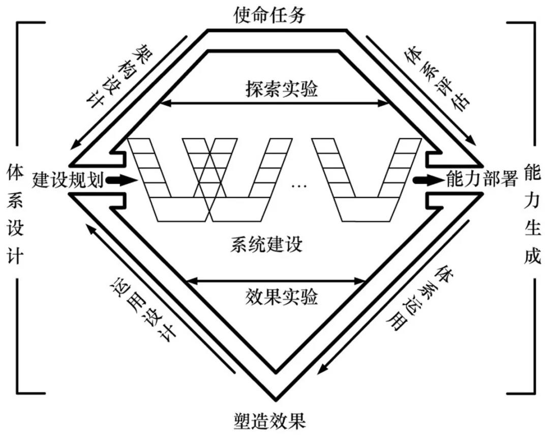 体系工程“钻石”模型是以使命任务为起点,以塑造效果为目标,将架构设计、运用设计、探索实验、建设规划、体系评估、能力部署、体系运用、效果实验等8个过程有机融地合为一个整体进行综合治理的体系工程方法。