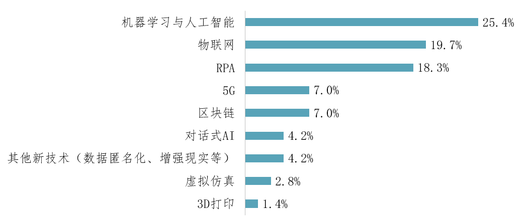 参评企业积极应用AI、IoT、区块链等新技术。其中,应用比例最高的是机器学习与人工智能技术,占比为25.4%。其次为物联网技术,占比为19.7%,第三位为RPA技术,占比为18.3%。AI在众多行业都能找到落地场景,与企业具体应用场景相结合,成为帮助传统行业数字化转型的重要工具。应用物联网技术的企业主要是制造业,其中占比最高的为汽车制造业企业。RPA技术主要应用于企业财务领域数字化转型项目中。