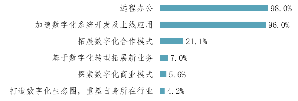 受疫情影响,远程办公成为大部分企业的“刚需”。绝大多数企业都能够高效应对不同规模的员工远程办公需求。疫情冲击下,众多企业加速了数字化项目的建设和上线,并提升了数字化转型在企业的战略高度。一部分企业在疫情期间借助数字化工具积极拓展与生态圈其他企业的合作,尝试拓展新业务,并探索新的商业模式。小部分行业领军企业基于自身的数字化转型,积极推动数字化生态圈建设,带动其所在行业产业生态变革。
