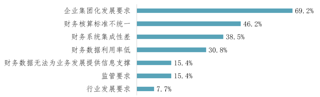 报告中分析了企业做财务、人力、供应链、营销四个领域数字化转型的动因及目标。以财务数字化转型动因和目标为例,申报财务数字化转型单项奖的企业中,大多数为大型企业。企业集团化发展要求、财务核算标准不统一、财务系统集成性差成为推动企业财务数字化转型的前三位的因素。这些原因也是大型企业尤其是业务多元、分子公司众多的集团型企业财务管理的普遍痛点。