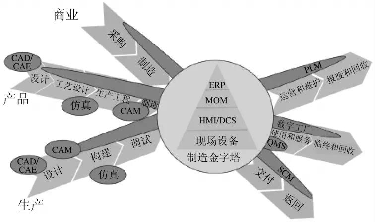 德国工业4.0提出了三大集成:纵向集成是企业内部信息流、资金流和物流的集成,是全要素的全面连接;横向集成是企业之间通过价值网络进行横向资源整合,这是一种上下游产业链的全面连接;跨整个价值链的端到端集成,是围绕产品设计、生产制造、物流配送、使用维护的产品全生命周期管理,是实现产品整个价值链数字世界和真实世界的整合,这是价值链的整合[4]。如图2所示,美国国家标准技术研究院(NIST)在其提出的“制造金字塔”中,阐释了现代制造系统产品、生产制造、经营业务3个“维度”的生命周期,这3个维度与德国工业4.0提出的三大集成在基本逻辑上高度一致[6]