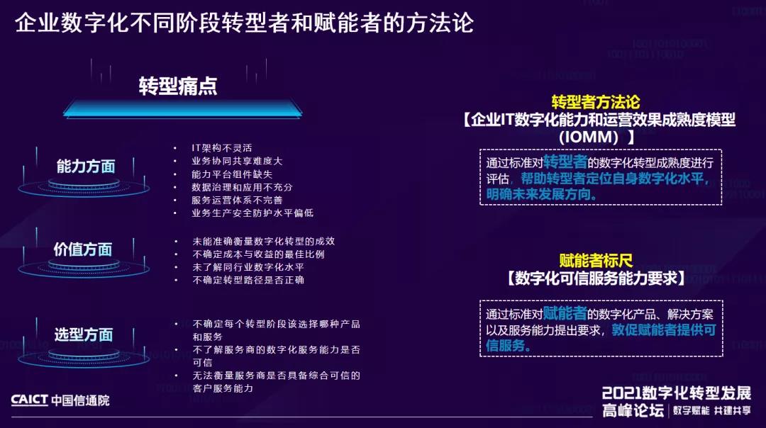 栗蔚进一步阐述称,企业数字化的过程中,都面临着不同的痛点与挑战。因此,转型者和赋能者有着不同的方法论,自然也应有不同的评估标准。其中,企业IT数字化能力和运营效果成熟度模型(IOMM)可用于对转型者的数字化转型成熟度进行评估,帮助转型者定位自身数字化水平,明确未来发展方向;而数字化可信服务能力对赋能者的数字化产品、解决方案以及服务能力提出要求,敦促赋能者提供可信服务。