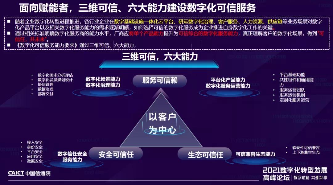 面向赋能者的《数字化可信服务能力要求》系列标准,从三维可信提出六大能力。三维可信包括服务可信赖、安全可信任和生态可信任,六大能力包括以客户为中心的数字化场景、数字化治理、平台化产品、数字化服务运营、数字信任安全服务和可信兼容生态。该标准明确数字化服务的综合可信服务能力水平,帮助厂商从单个产品能力提升为可信综合的数字化服务能力,真正理解客户的数字化场景,做到“可信任,共未来”。其中,该标准首次提出数字化生态兼容方面的能力要求,帮助数字化服务商适配多种生态环境和技术路线,促进上下游数字化生态健康发展。标准体系适用范围覆盖数字基础设施一体化云平台、研运数字化治理、客户服务、人力资源、供应链等多个环节数字化服务。