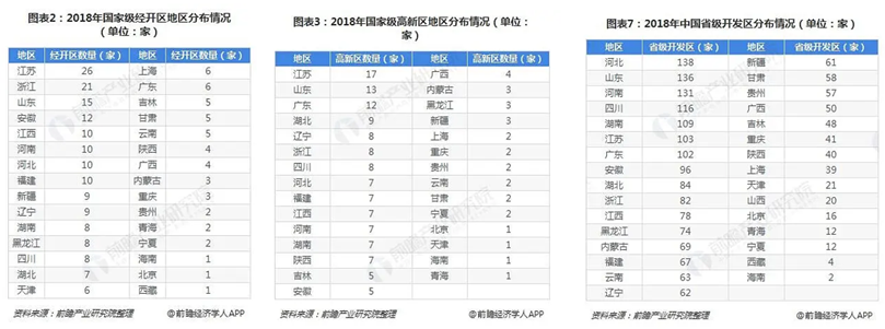 2018年国家级的开发区数量达到552家,省级开发区1991家,分布在全国31个省市。经核准的省级产业园区数量超过100家的省份有河北、山东、河南、四川、湖南、江苏和广东等7个地区。
