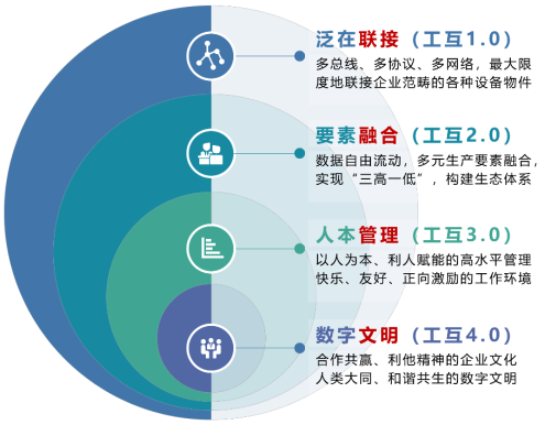 第三层为人本管理。这是企业不可或缺但往往被忽视的内容。在企业内,通过与工业互联网理念相匹配的思想、战略、组织、流程、人才队伍,建立以人为本、利人赋能的高水平管理,塑造快乐、友好、正向激励的工作环境;在企业间,基于诚信合作的精神,与客户、上下游合作伙伴建立合作共赢的生态模式。该层是工业互联网必须要实现的高阶内容。这在工业互联网发展水平上属于利人赋能,简称“工互3.0”。