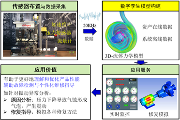 如图3所示,ANSYS构建了泵的数字孪生,首先在泵上布置了加速度计、压力传感器、流量计等传感器,与控制器采集的数据共同支撑泵数字孪生模型的构建,基于模型的动态交互等特点可提供实时检测与修复模拟等服务,通过泵的数字孪生有助于更好地理解和优化产品性能,并辅助故障检测与个性化维修指导。例如,通过泵的数字孪生模型发现了对某异常振动的根本原因的分析,即压力下降导致气蚀形成气泡,产生振动。[5]