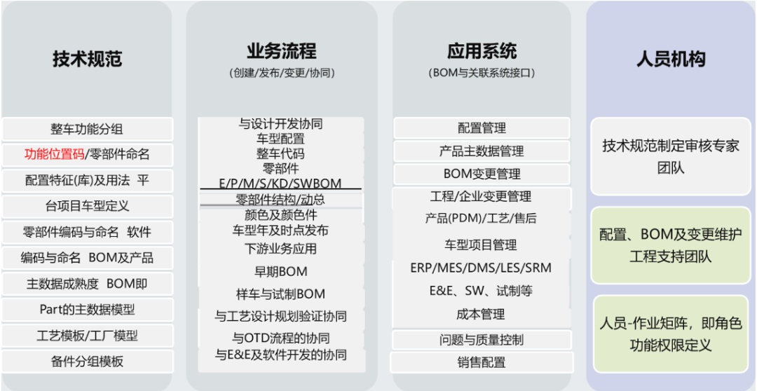 构建全新的满足定制化需求的车型配置选装管理模式;基于中央制造BOM集中管控,实现面向多基地生产的制造管理模式;打通上下游(工程、制造、售后)协调一致的的变更实施管控机制;基于售后工程介入工程方案评估的同步工程设计模式。