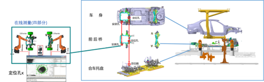 采用数据互联及大数据应用技术实时监控合装过程质量,保证自动合装的一次通过率。从车身及总装车间在线测量设备采集的数据中抓取与合装相关的尺寸数据,上传至工厂云端数据中心,根据匹配策略利用统计学相关算法,建立虚拟匹配模型,在实车进入合装工位作前提前识别合车风险,并将分析结果反馈至各车间工位上,提前应对解决,保证自动合装高质量通过。