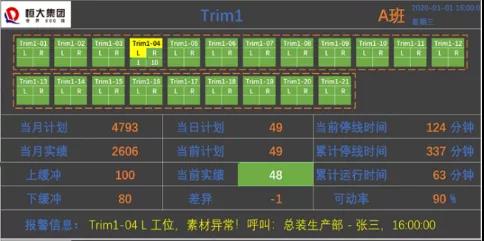 一般生产过程中工件配有图纸、工艺卡、生产过程记录卡、更改单等纸质文件作为生产依据。恒大在智能工厂规划中普及信息化终端到每个工位,结合轻量化三维模型和MES系统,车辆抵达工位时,可以根据具体车辆配置信息在该工位显示屏终端显示对应该车型配置的电子工艺卡片,操作工可直接通过工位显示屏查看工艺卡片,而不需要自己去查找并切换;操作工人将可在终端接受工作指令,接受图纸、工艺、更单等生产数据,可以灵活地适应生产计划变更、图纸变更和工艺变更。也可以利用智能手机作为终端,完成生产信息查询等工作。