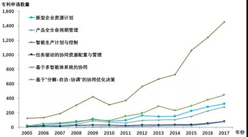 图3展示2005—2018年先进管理技术领域专利申请数量的变化趋势。智能生产计划与控制专利数量呈现较快增长趋势,尤其是2011年以后呈现指数型增长趋势。值得注意的是:“工业4.0”概念正是2011年德国举行的汉诺威工业博览会上提出,而智能生产计划与控制正是“工业4.0”内涵的重要实践之一。“分解-自治-协调”的协同优化决策、新型企业资源计划、产品生命周期管理在2011年后也呈现一定的增长趋势,顺应制造新模式的新需求而生。总的来说,制造新模式对管理思维、方法和工具都提出新的挑战,工业界和学术界也积极应对新的挑战,不断地开发满足先进管理技术要求的新产品。