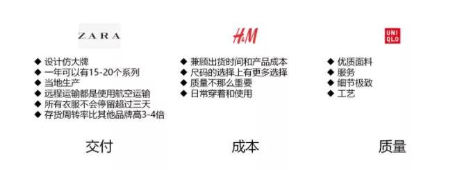 H&M则兼顾出货时间和产品成本、在尺码上有更多选择、质量不那么重要、主要用于日常穿着和使用。换言之,H&M不是特别看重质量,但是它会为你的日常生活提供尽可能多的选择。因此,从某种意义说,它更倾向于成本控制。