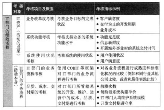 很多企业都会就IT部门对经营和业务的贡献度进行定期考核,在CIO交接时,为了把握IT部门改革的必要性,通常也会进行相应的考核。IT部门的绩效考核通常分为两个方面:对IT部门的活动成果,即“IT资产”的考核,以及对IT部门的活动本身,即“业务流程”的考核。