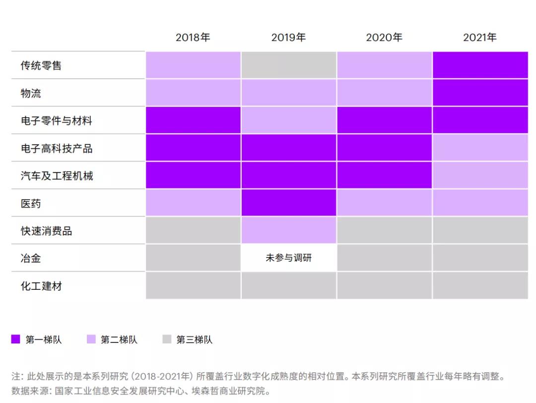 四年来,中国各行业企业整体数字化进程稳步推进,数字化能力建设整体行程已然过半。在此过程中,受市场环境、行业特征以及数字化基础等因素的影响,不同行业的数字化成熟度存在显著差异。研究按各行业数字转型指数得分,将九大行业分为三梯队。