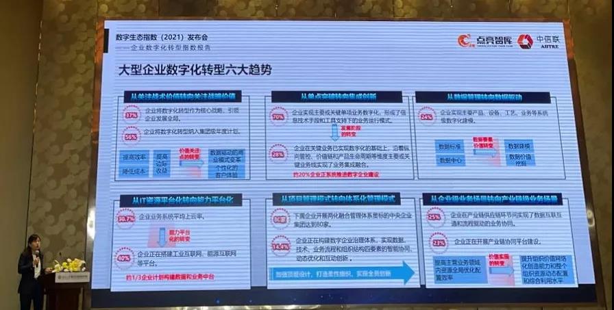 10月16日,点亮智库&中信联在数字生态指数(2021)发布会暨重庆市数字经济开放论坛重磅推出《企业数字化转型指数(2021)》,该指数是《数字生态指数2021》报告的重要组成部分,科学评估和全面展示了全国及区域企业数字化转型现状水平、发展趋势及存在问题。