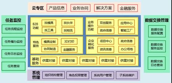 横沥模具产业云专区集B2B供需对接、在线交易、模具定制、协同生产、产学研对接和双创服务为一体,项目建设具体目标概括为“一个专区,六大功能,N个特色服务”。践行“互联网+模具”战略,实行“一对一”解决方案的同时引导企业将营销网络化、管理云端化、效率数字化、企业智能化。推进横沥镇模具产业模式创新,增强产业聚集效应,提升品牌竞争力。开展横沥模具云制造项目对接与改造,提升模具企业整体资源的使用效率和设计制造协同能力,依据实际情况,拓展开发航天云网模具产业云制造服务平台。(图2)