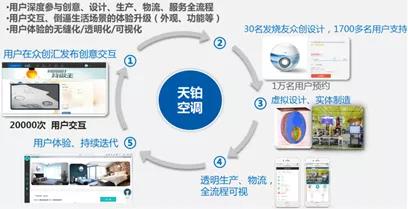海尔天铂圆形的空调实际上是用户参与而交互设计出来的。最早与海尔交互的一个网名叫DK先生的用户,他提出了一个创意,要把首都鸟巢体育馆的外形设计成为一种空调。海尔有关人员经过讨论后认为有可能实现,于是把此创意发布在海尔HOPE设计平台上。通过虚拟设计的手段,做成数字化的样机放在平台上,由更多的用户去交互,同时也吸引了许多一流资源(如3M等)一起来设计方案,最终形成了天铂一代。他们在网上推出定制,通过网络客户大数据又可以实现持续的迭代。与传统定制不同的是,不是一次性硬件定制,是全周期持续地与用户交互,而且把碎片化需求整合进而形成用户圈。图1是用户数据驱动天铂空调创新的例子。从图中可以看出,天铂这一创新产品形成的过程中用户数据是如何发挥作用的。用户在众创汇发布创意交互数据,30名发烧友进行众创设计,1700多名用户支持,1万多名用户响应。设计部门形成虚拟设计,持续与用户迭代。用户数据发生在创意、设计、生产、物流、服务的全流程。