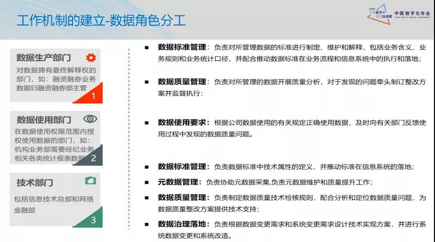 数据角色分工是数据工作机制建立的基础。有关数据工作的部门可以分为数据生产部门、数据使用部门和技术部门,从而建立相应的数据标准管理、质量管理、使用要求、元数据管理等制度。