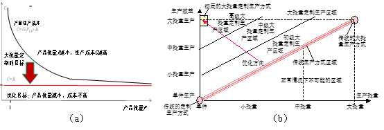 图3(b)描述了大批量定制的优化方向:批量越来越小,效益越来越高,最终是在单件生产中实现大批量生产的效益。
