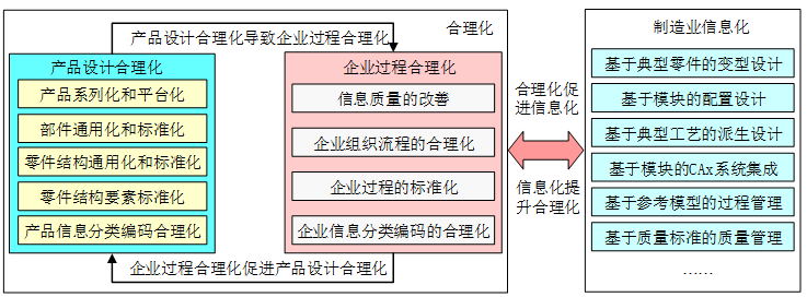 图5描述了合理化工作框架。制造业信息化中的合理化工作主要包括产品设计合理化和企业过程合理化,而这两者往往是相互关联的。产品设计合理化和企业过程合理化的本质也就是标准化。模块化是产品合理化中的主要内容之一。人们也已经发现企业组织跨功能的协同化和产品模块化都对大批量定制产生显著影响[12]。