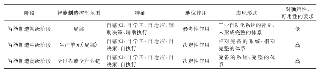 如上所述,在智能制造初级阶段,智能制造系统自身不构成完备的系统,而是作为工业自动化系统架构体系的重要补充,在工业生产中发挥重要的参考和补充作用; 在智能制造中级阶段,智能制造围绕特定的生产单元形成了完备的自治系统,在局部发挥决定性作用,传统的工业自动化系统将作为后备; 在智能制造高级阶段,形成了完整的智能制造架构体系,在生产过程的各个层面中全面发挥决定性作用。总结智能制造发展过程 3 个阶段的特征见表 1。
