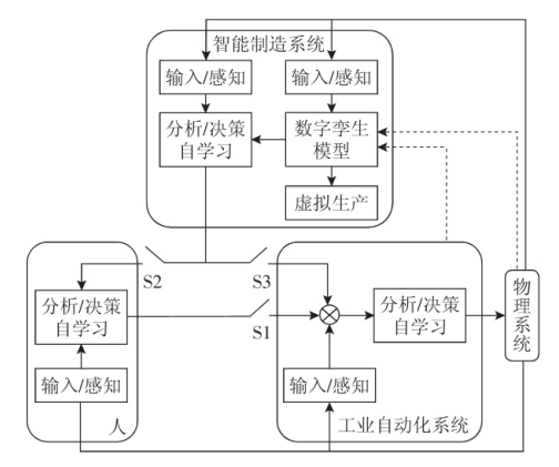 生产单元的数据流如图 2 所示。图 2 中: 箭头方向表示数据的流向; 开关符号定义数据的接通或断开; 实线表示实时数据; 虚线表示非实时数据,包括历史数据、系统参数等; S1 表示人对工业自动化系统的设定操作和干预是否有效; S2表示智能制造系统的输出是否反馈给人作为设定操作和干预的参考; S3 表示智能制造系统的输出是否作为工业自动化系统的设定。