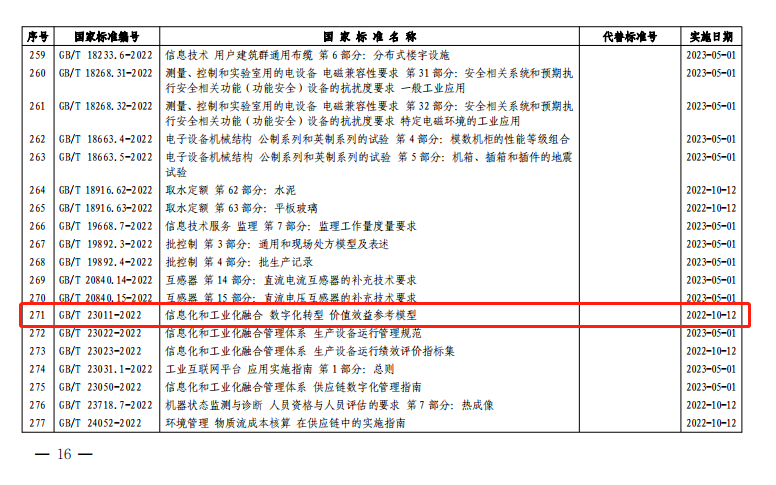 2022年10月14日,国家市场监督管理总局(国家标准化管理委员会)发布2022年第13号中国国家标准公告,批准国家标准GB/T 23011-2022《信息化和工业化融合 数字化转型 价值效益参考模型》正式发布。该标准在工业和信息化部信息技术发展司和科技司的支持与指导下,由全国信息化和工业化融合管理标准化技术委员会(SAC/TC573)归口,北京国信数字化转型技术研究院、国家工业信息安全发展研究中心等产学研用50余家单位共同研制,是立足两化融合发展过程中数字化转型效益衡量这一关键需求研制发布的一项重要国家标准,对以标准引领两化深度融合、加快新型工业化发展具有重要意义。