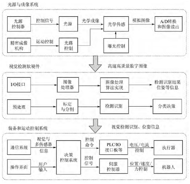 对于特征明显并且不随放置位置变化的部位,设计相应的直接特征提取算法,利用特征检测识别该部位是否加工。而对于特征不明显或者特征可能变化的部位,利用模拟人类视皮层中物体识别机制的机器学习算法自动提取部位特征并利用SVM算法识别。系统的实际运行情况表明,该方案可以快速有效的识别工件是否合格,错误率约为千分之五,基本上达到了人眼的识别率。通过图像识别检测方法,智能制造装备可实现目标识别和分类、缺陷检测、视觉测量等功能。图像识别面临的主要难题包括检测对象多样、特征多变、几何结构精密复杂,处于高速运动状态。基于视觉检测和控制技术的智能制造装备虽然功能、作业对象、结构、运动控制方法、图像处理方法差别较大,但其原理方案却基本相同,如图1所示。