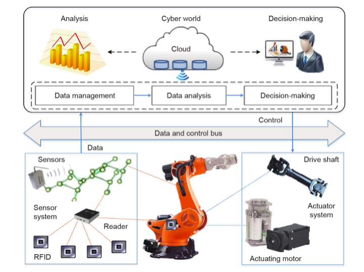 CPS集成了3C技术,使物理流程具有精确控制、远程协作、自主管理和其他功能。CPS与物理过程紧密耦合。智能来自数据。传感器和执行器与物理世界交互以进行数据交换是CPS最重要的功能。它们负责从物理机器和环境感知状态,以及执行控制命令。如图5所示,通过分布在物理设备和环境中的多个传感器,进行大规模分布式数据采集(如材料属性、实时性能和环境条件)和状态标识,以实现使信息世界和物理世界之间的交互。通过信息世界的数据管理、处理和分析,基于预定义的规则和控制语义生成控制命令。控制命令被反馈给执行器,而后执行器根据控制命令执行操作并适应变化。数据和控制总线为实时通信和数据交换提供支持。通过传感器和执行器,物理过程的任何变化(如行为、条件或性能)都会导致信息世界的变化,反之亦然。因此,CPS的侧重点是传感器和执行器。