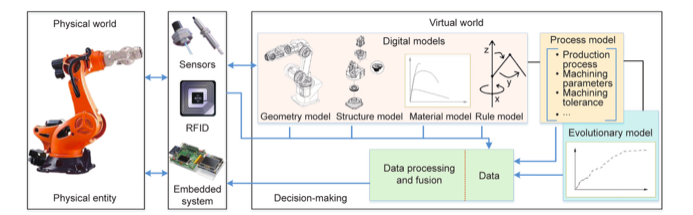 DT是与信息物理融合相关的另一个概念。DT是在虚拟空间中创建物理对象的高保真虚拟模型,以模拟其在现实世界中的行为并提供反馈。DT反映了双向动态映射过程。它打破了产品生命周期的隔离,提供了完整的产品数字足迹。因此,DT使公司能够更快、更准确地预测和检测物理问题,优化制造流程,并生产更好的产品。