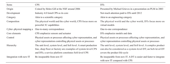 从广义上看,CPS和DT具有类似的功能,并且都描述了信息物理融合。但是,CPS和DT并不完全相同。本节从不同角度提供比较和联系,如表1所示。