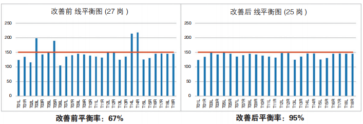 改善后(图 2 右):通过 ECRS 手段将作业工序进行重新拆分和排布,提升线平衡率,减少等待浪费,经过优化后,线平衡图饱和度有大幅度的改善,岗位数也较此前有 2个岗位的优化。