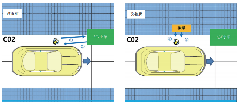 改善前(图 4 左):员工从 AGV 小车拿取碳罐,再步行至车体左侧安装