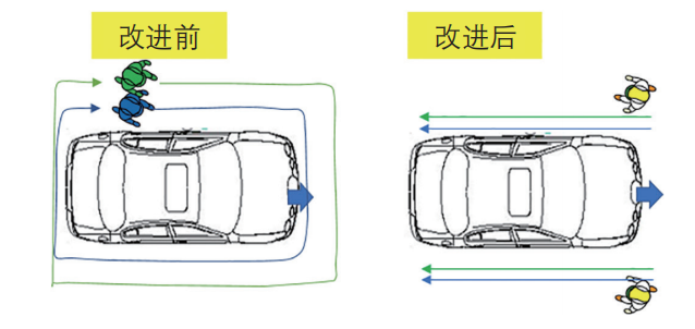 改善后(图 5 右):调整作业内容,两名员工各负责一侧,对所负责一侧的内饰及外饰进行检查,这样就减少了作业过程中的动作浪费。