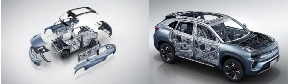国际轻量化设计研究主要包括轻量化材料的运用、结构轻量化设计与优化、复合材料替代技术、先进的净成形工艺等,涉及产品包括工业装备、家电产品、电器电子产品、汽车和飞机等。奇瑞新能源作为我国汽车轻量化的标杆级企业代表,旗下热门车型纯电SUV蚂蚁采用超轻量化全铝车身架构,并设计了独有的隼骨型多腔截面结构,整车车身铝合金使用率超过86%,重量减少30%,刚度提升20%,材料利用率达到96%,其车身架构如图3所示。