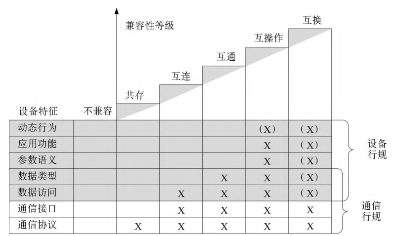 IEC TR 62390《通用自动化设备 行规导则》定义了基于行规的设备的兼容性等级,以使设备处于相同的通信平台,并按等级区分设备之间确定的兼容性程度和互操作性程度。在该标准中,设备的兼容性等级可分为不兼容、共存、互联、互通、互操作和互换(见图1)。