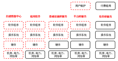 如图5所示,最初所有需要庞大计算量的用户都需要自己搭建数据中心。需要自己配置机房、电力、网络等资源,并利用这些资源安装硬件设备与操作系统,才能在系统上运行软件并提供服务。后来某些没有足够财力、人力的用户开始向大型企业租用硬件设备,来完成自己的计算任务。20 世纪六七十年代,在IBM 提出虚拟机的概念后,租用虚拟机的方式为广大需要大规模计算任务的用户提供了方便,尽管没有达到"云化"的程度,但已经具备了云计算的雏形。