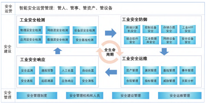 某生物技术有限公司拥有11个厂区,本项目需要在满足政策合规的前提下,通过建设企业级工业互联网安全态势感知与综合管控服务平台,实时掌握各生产厂区工业系统的网络安全态势,及时通报预警重大网络安全威胁;形成企业和下属各生产基地相关部门协调联动的网络安全监测预警处置工作机制,构建网络安全综合防控体系;最终形成工业安全检测、工业安全防御、工业安全运维、工业安全响应的闭环体系,如图1所示。