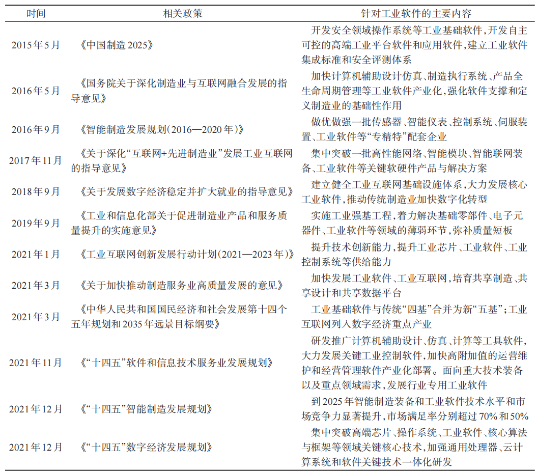 表1 中国工业软件发展相关政策