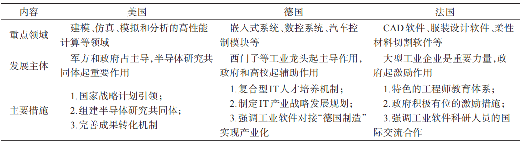 对美国、德国、法国工业软件发展经验借鉴中的重点领域、发展主体和主要措施进行整理,如表3所示。