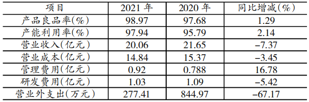 在将基于数字孪生的智能制造成本控制系统应用于生产环节后,远东传动优化了新产品设计研发流程,增强了产品设计方案的可靠性,提升了产品生产质量及生产计划的合理性,因设备损毁导致生产停滞情况得到有效控制,增强了企业盈利能力,降低了企业智能制造总体成本支出,有效推动了企业长远发展。为充分展示远东传动基于数字孪生的智能制造成本控制系统应用效果,通过查询年报对企业2020—2021年部分数据进行 了汇总,具体如表1所示。