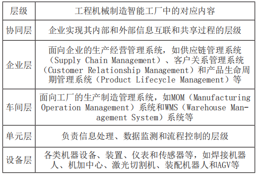中国工业和信息化部与国家标准委员在国家智能制造标准体系建设指南(2018年版)中,将智能制造系统架构划分为五个系统层级,包括设备层、 单元层、 车间层、企业层和协同层。基于该建设指南,结合工程机械智能制造工厂的实际情况,列出了对应的智能制造层级和具体内容,如表1所示。