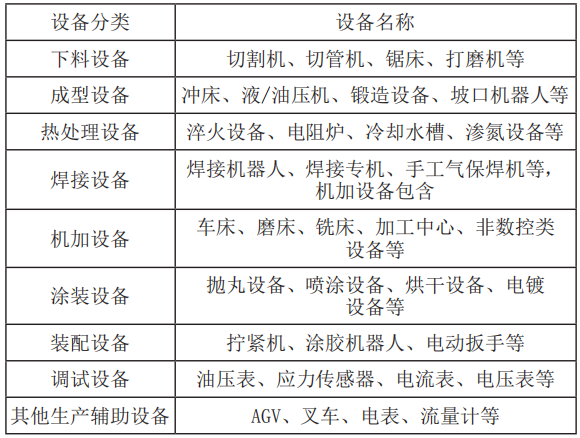 工程机械制造行业设备按八大工艺区分,可分为下料设备、成型设备、热处理设备、焊接设备、机加设备、涂装设备、装配设备、调试设备,以及其他生产辅助设备,详如表2所示。