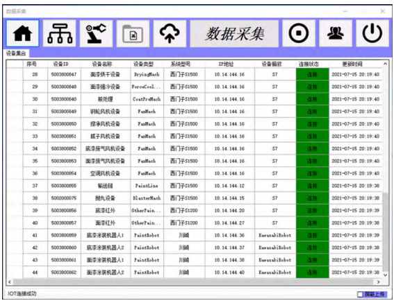 本通用数据采集系统已成功应用于工程机械制造智能工厂,实现了设备数据包括设备的基本信息、设备状态、工艺参数等信息的采集。系统软件界面如图7所示,数据采集覆盖工厂90%以上的设备,支持通信协议20余种。