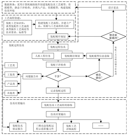 工艺过程仿真的顺序包括:①数据准备,完成工艺模型的建立与导入;②装配工艺流程创建,完成工艺流程顺序的建立、调整,为流程中的各节点指派产品和资源模型,并验证装配流程的有效性;③装配过程仿真,通过装配路径规划实现装配工艺过程仿真、人机工程任务仿真,并检查装配过程中产品零部件或资源的动态干涉和碰撞情况,验证装配工艺的可行性;④装配工艺过程问题分析与处理,通过分析结果,对装配顺序、装配空间、装配路径、人机工效等方面存在的问题进行反馈与优化;⑤装配仿真结果的输出,得到效果清晰、重点突出、便于观察的视频文件,并在装配仿真中需要添加必要的修饰,最终生成相关的分析报告和视频文件。