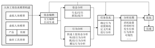 产品装配过程中的人机工效仿真是指在产品进行真实装配之前,将产品及资源对象的三维实体模型在仿真软件系统中建立起来,在虚拟环境中利用三维人体模型模拟人的实际工作情况,实现三维人体在制造环境中与其所制造、安装、操作、维护的产品之间互动关系的动态仿真,以分析操作人员在该环境下的姿态、负荷等,验证装配操作的可视性、可达性、可操作性等,提高装配效率,并从工效学的角度对人体姿态做出评估与改进,使之更能满足作业要求以及达到安全舒适、高效的标准。产品装配中人机工效仿真典型的作业流程如图3所示。