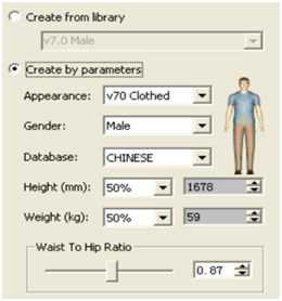 人体模型的建立是进行人体任务仿真的基础,数字仿真软件能够根据国家、性别、百分点、身高、体重、承载能力等参数自动生成人体模型,也可直接从工厂建立的人体模型库中选择数学模型,并通过编辑参数使之与工人的实际情况相符。对于特殊工序的人机工程仿真,应根据生产现场操作者的特征建立其三维人体模型。在某些特定的工作中,比如狭小的空间里钻孔、铆接或者打保险等,需要模拟人体手部的详细动作,分析手的可操作空间,对于这种情况,可单独建立人的局部三维模型,人体模型的创建示意图见图4。