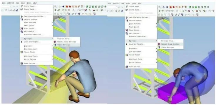 姿态分析是通过求解人体的运动学和动力学模型对行走、定位、抓取和举放等姿态进行评估,以及进行人体受力及疲劳分析等。针对产品装配过程中人体姿态的计算,可根据人体参数、作业点、作业力方向、人体位置及人体操作方式等计算上下体姿态角,判断可工作域,自动调整人体姿态,以实现自动控制及姿态计算,并使人体达到最舒适状态。