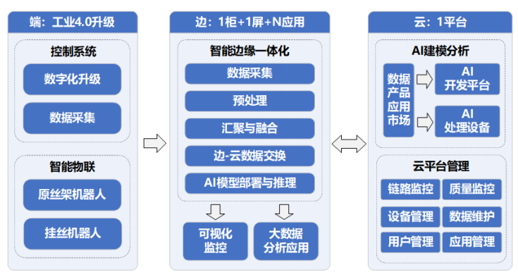 基于解决化纤产品质量检测难题的阶段性研究成果,综合应用连接、计算、AI 与云技术,将“端—边—云”有机串联并形成业务闭环,形成了一套基于“端—边—云”协同架构的垂直行业工业互联网应用范式,如图 4 所示。