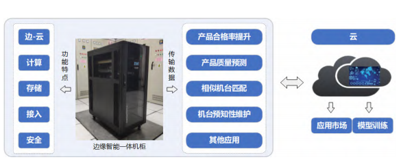 通过物联网(IoT)智能网关实现一站式产线数据采集,配备搭载自主可控 AI 芯片的边缘计算设备与中心节点服务器,能够以稳定、高效、便捷的方式在产线边侧快速部署数据预处理、融合、存储、边—云数据交换、多维数据分析等功能,覆盖数据生命周期的各个阶段。此外,该机柜配备了防火墙以及一系列安全措施,在实现“端—边—云”协同计算架构的同时,保障产线数据与各设备的安全可靠。